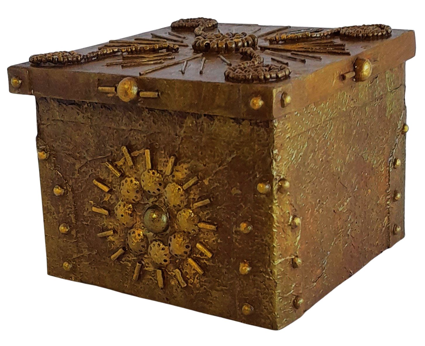 Caixinha baú decorada confeccionada com placas feitas de sobra de papelão de embalagem, tampa imantada, pequenos detalhes feitos com miçangas, canutilhos e meia pérolas. Pode ser usada como porta joia, guardar pequenas peças ou simplesmente como objeto de decoração. Peça exclusiva.
