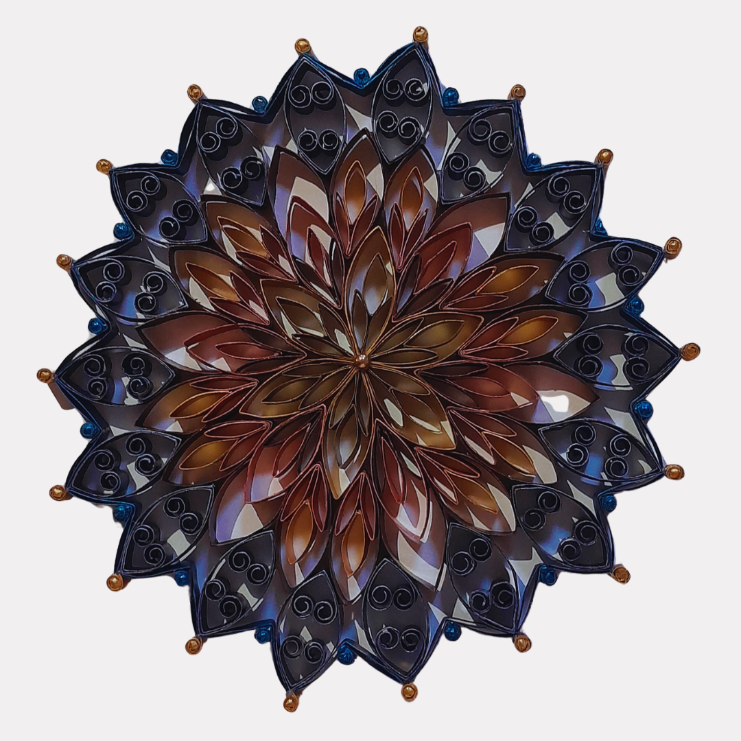 Mandala confeccionada com bobina de papel toilette, pintura acrílica e verniz. Utilizada como decoração de parede ou pendurada como móbile. (Peça exclusiva.)
