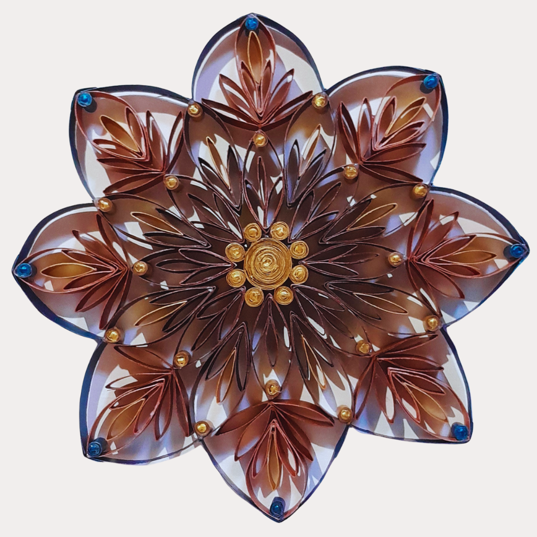 Mandala confeccionada com bobina de papel toilette, pintura acrílica e demão de verniz. Pode ser utilizar como decoração de parede ou pendurar em modo móbile. (Peça exclusiva.)