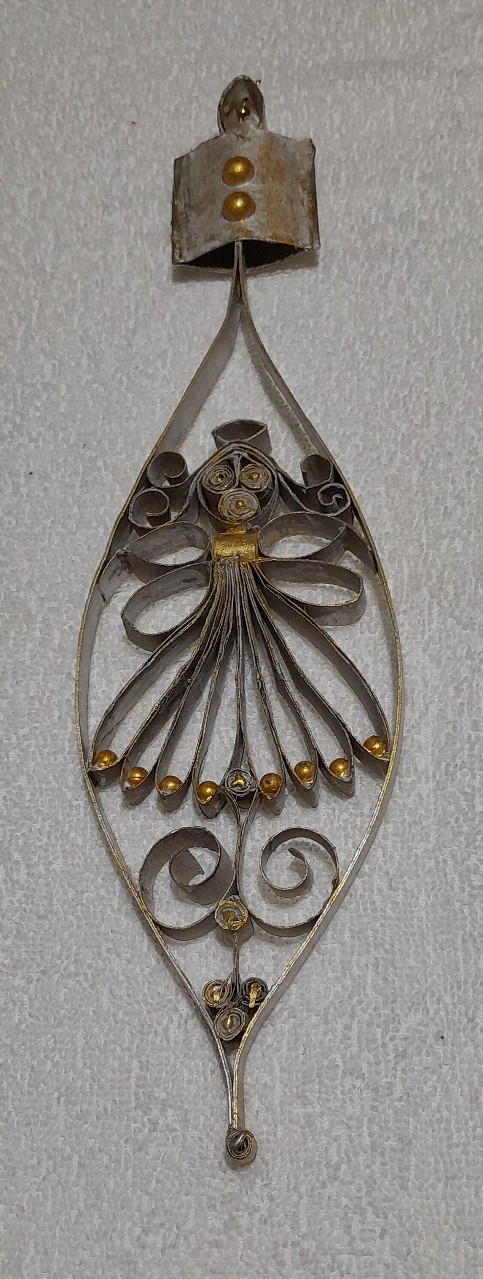 Pendente Anjo Dourado, na cor branca e dourado, confeccionado com papelão de rolinhos de papel toilette, decorado com pérolas.